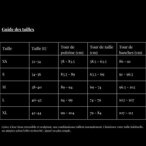 - Élasthanne (22 %) : apporte une élasticité optimale et un effet gainant naturel. Le tissu s’adapte parfaitement aux mouvements du corps et reprend toujours sa forme, idéal pour le sport et le quotidien.